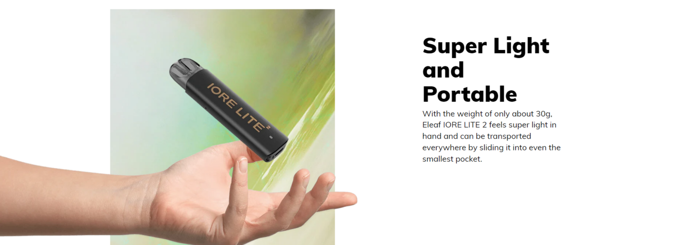 Με βάρος μόνο περίπου 30 γραμμάρια, το Eleaf IORE LITE 2 αισθάνεται εξαιρετικά ελαφρύ στο χέρι και μπορεί να μεταφερθεί παντού βάζοντάς το ακόμα και στην πιο μικρή τσέπη.