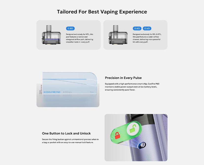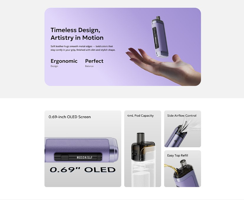 Δεν χρειάζεται να επαναφορτίζετε το άτμισμά σας τόσο συχνά όσο πριν. Η μεγάλη χωρητικότητα υγρού 4ml εξασφαλίζει επίσης μακροχρόνιο, αδιάκοπο άτμισμα. Μπορείτε να ρυθμίσετε την ισχύ από 6W σε 60W και τη ροή αέρα για ομαλή εναλλαγή από MTL σε RDL.