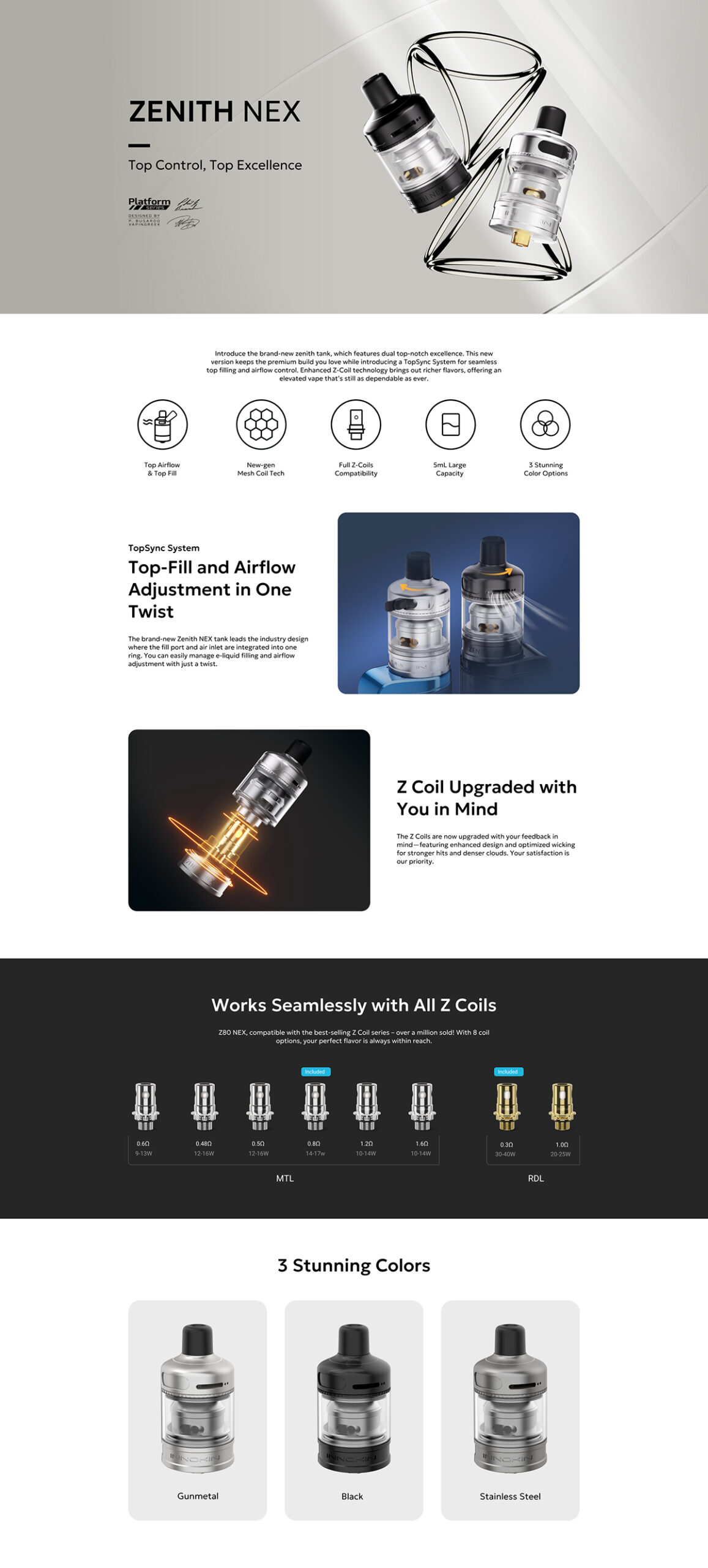 Παρουσιάζουμε τον νέο ατμοποιητή Zenith Nex 5ml. Αυτή η νέα έκδοση διατηρεί την premium κατασκευή, ενώ παρουσιάζει ένα σύστημα TopSync για απρόσκοπτη πλήρωση και έλεγχο ροής αέρα.